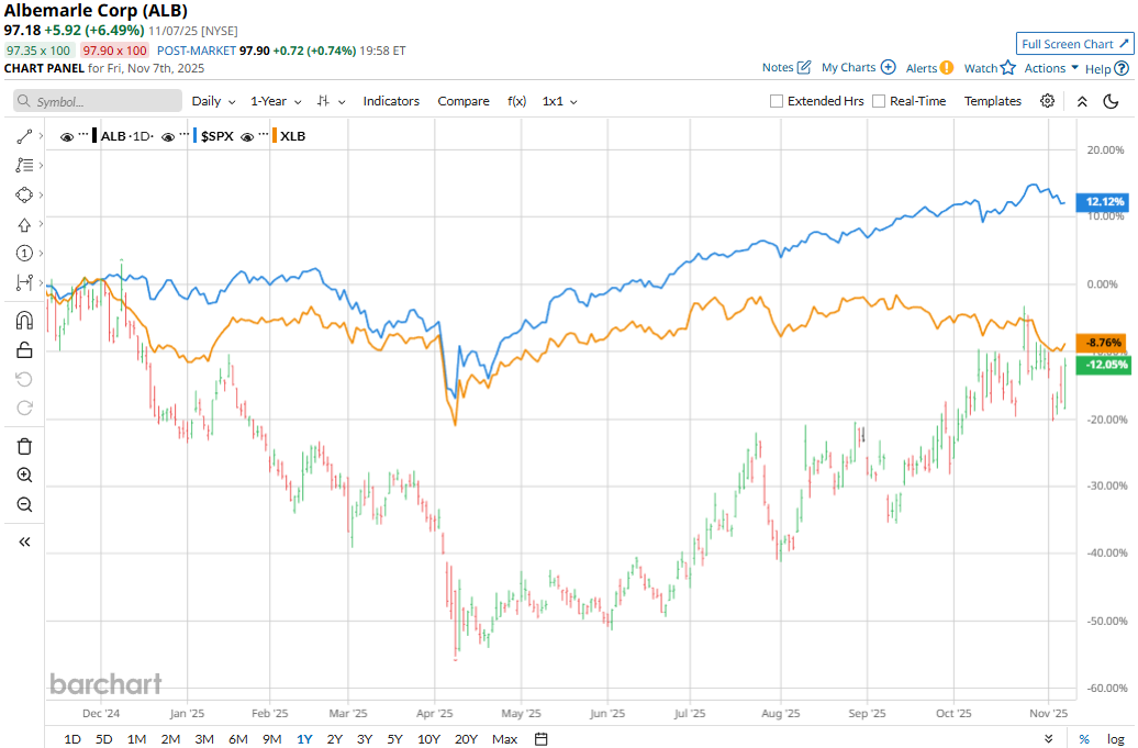 Specialty chemical giant Albemarle has notably underperformed the broader market over the past year. ALB stock prices have gained 12.9% on a YTD basis and declined 2.8% over the past 52 weeks, compared to the S&P 500 Index’s ($SPX) 14.4% gains in 2025 and 12.7% returns over the past year.