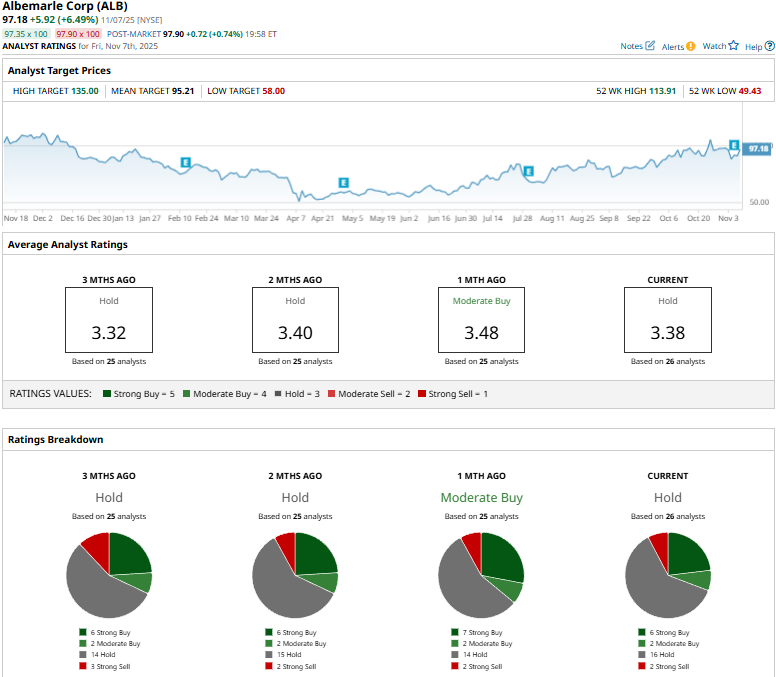 On Nov. 7, Truist Securities analyst Peter Osterland maintained a “Hold” rating on ALB and raised the price target from $87 to $91.