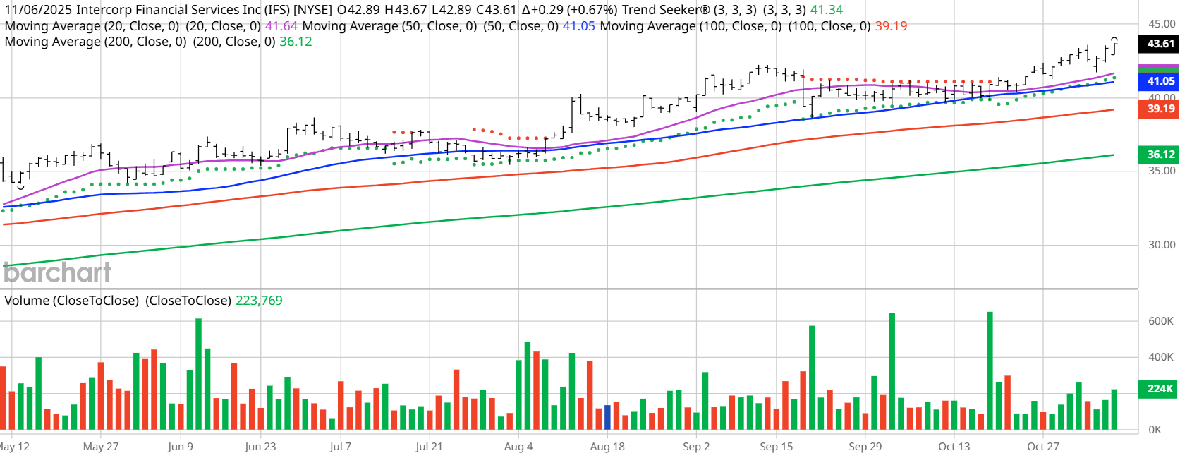 I found today’s Chart of the Day by using Barchart’s powerful screening functions to sort for stocks with the highest technical buy signals; superior current momentum in both strength and direction; and a Trend Seeker “buy” signal. I then used Barchart’s Flipcharts feature to review the charts for consistent price appreciation. IFS checks those boxes. Since the Trend Seeker signaled a new “Buy” on Oct. 20, the stock has gained 6.06%.